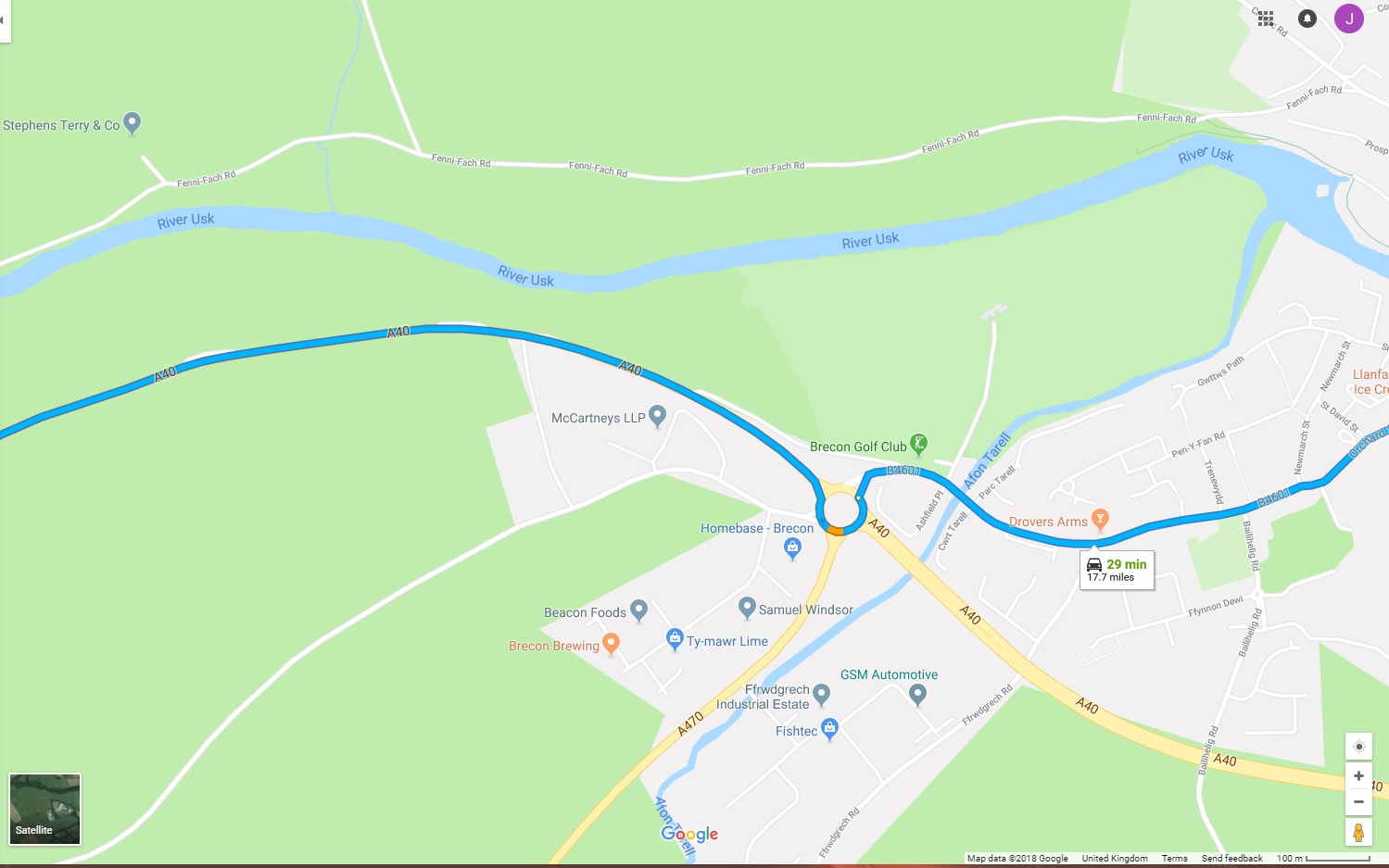 Follow the A470 into Brecon and then take the 3rd exit at the roundabout onto the B4601. Mosey on through the town following the B4061 on the route below…