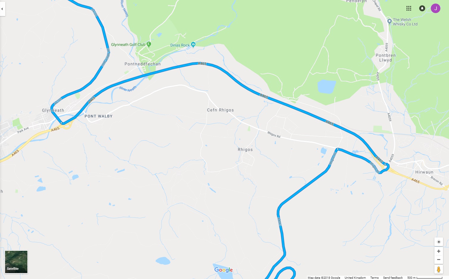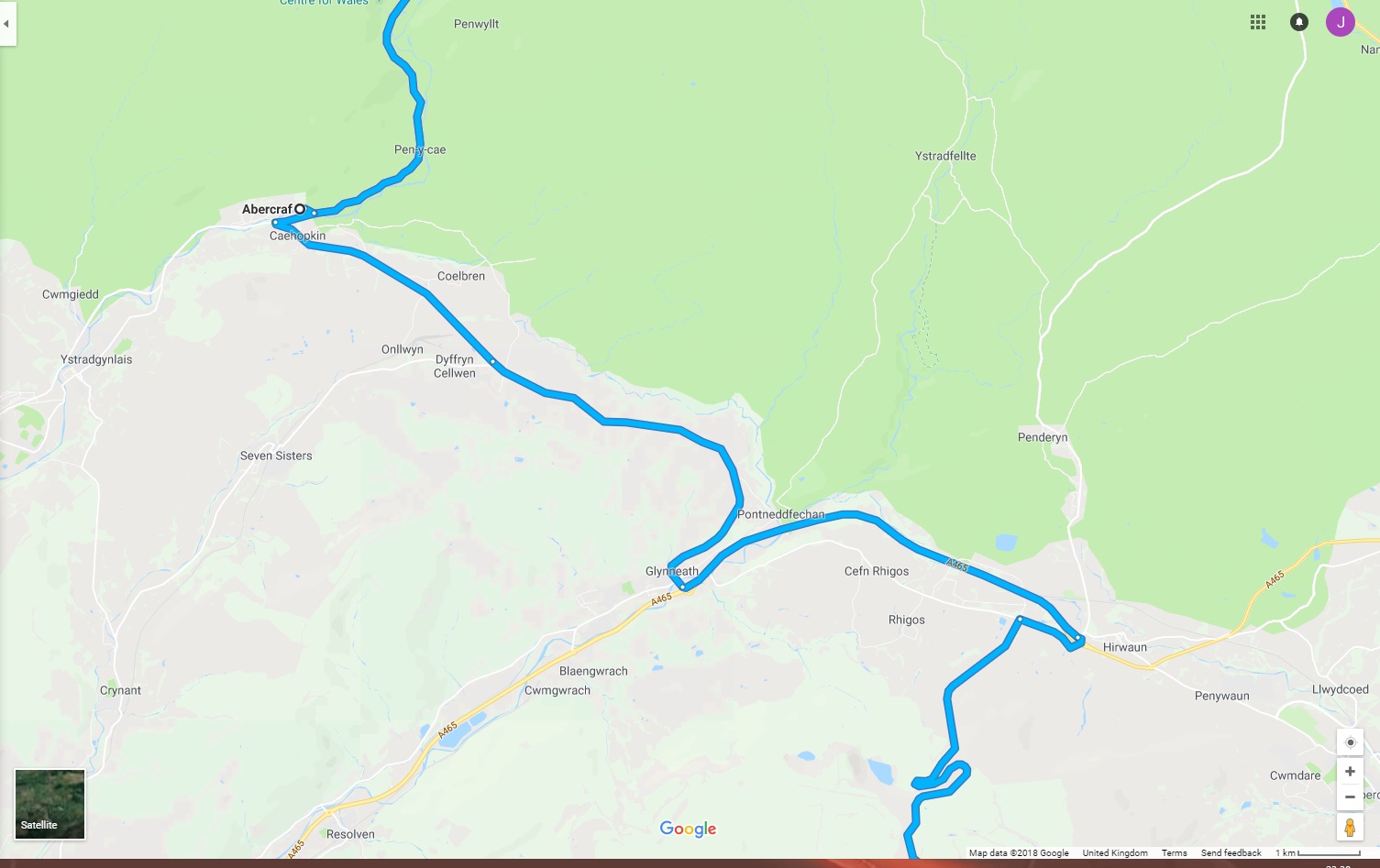 Once established on the A4221, nav to Sarn SuC and it should give you the correct route back. If not, nav to Glyneath, then Treorchy and finally Sarn. This route will take you onto the A4109 and then the A465 as you come through Glyneath.