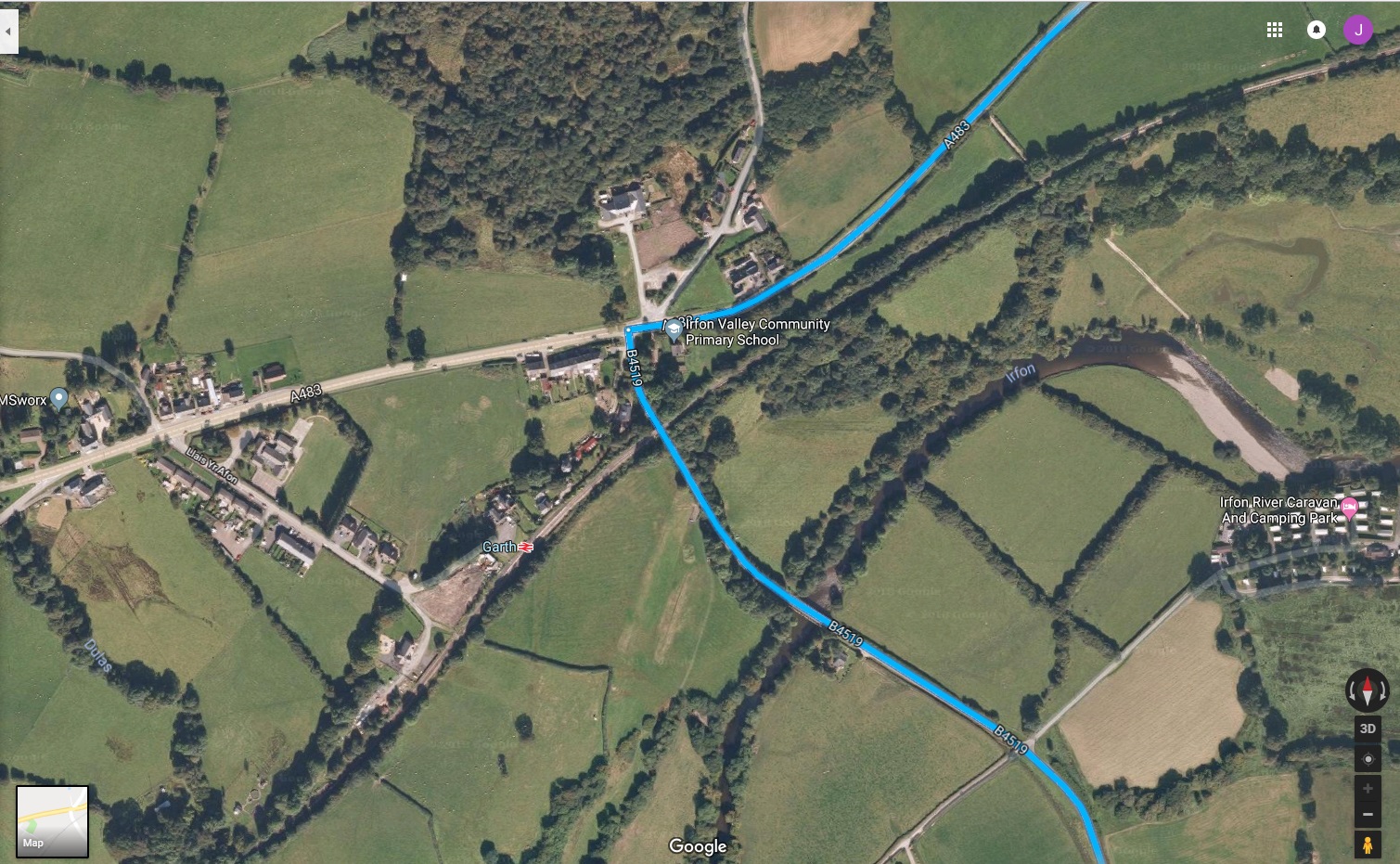 After this bend, just keep going along this road (ignore any Sat Nav, Google Maps instructions to the contrary trying to turn you right). The B4250 (Market Street) will become the A483, the staging road, towards Garth and the return southbound.
